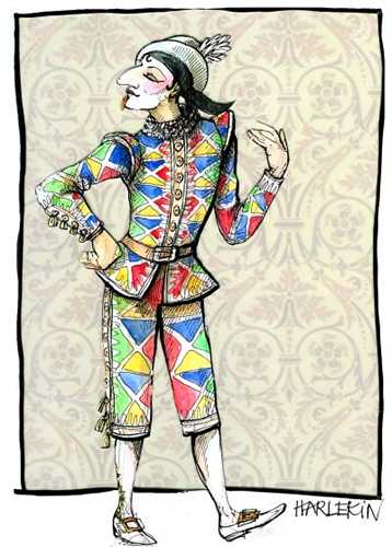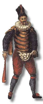aus Bologna, wie Pantalone ein Vertreter patrizisch-bürgerlicher Autonomie und ebenso wie dieser dauernd enttäuscht, getäuscht, betrogen. Dann einer der beliebtesten: Der Spaghetti-Spaßmacher aus Neapel, Pulcinella, in weißem Kostüm mit schwarzer Maske, dumm, faul, gefräßig, aber Realist.