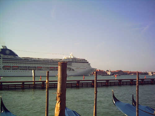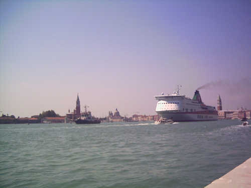 Der Giudeccakanal ist aufgrund seiner Wassertiefe die Wasserstraße für Kreuzfahrtschiffe in den Hafen Venedigs. Hier sieht man einige dieser "Pötte" (im Hintergrund die Insel La Giudecca) - die Besichtigung Venedigs beschränkt sich auf wohl einen relativ kurzen Landgang (6-8 Stunden), da wir einige dieser Kreuzfahrtschiffe am Vormittag ankommen und bereits am Nachmittag wieder abfahren sahen. Jährlich besuchen 12-15 Millionen Touristen die Stadt und die Stadtverwaltung versucht diese Zahl der Eintagestouristen zu reduzieren. In einem Tag kann man ja auch nur die Tour "San Marco - Rialto - Finito" erledigen. Den Flair dieser Stadt hat man auf diese Weise überhaupt nicht wahrnehmen. Dazu muss man sich viel Zeit nehmen.