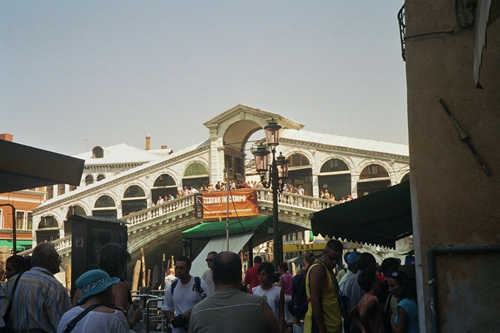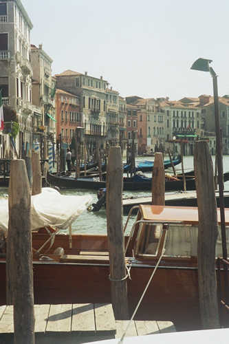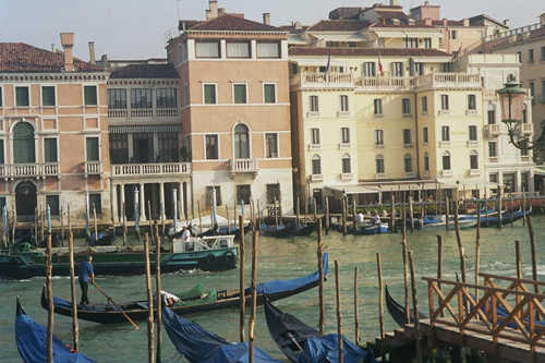 Heute wird fast der gesamte Fracht- und Personenverkehr Venedigs mit Motorbooten abgewickelt (auf dem rechten Bild sieht man die berühmten Wassertaxis). Es gibt aber auch die sogenannten Traghetti. Traghetti sind Gondeln, die tagsüber an bestimmten Stellen Fahrgäste übersetzen. Wer einmal billig Gondel fahren will, sollte dieses Vergnügen, sofern er nicht leicht seekrank wird, genießen. An den Gassen zum Canal Grande weisen gelbe Schilder auf die Traghetti hin. |
