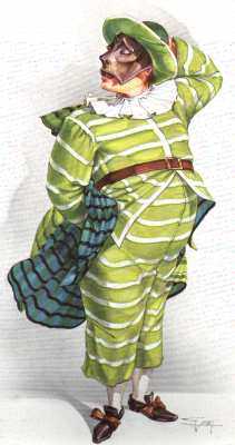 aus Bologna, wie Pantalone ein Vertreter patrizisch-bürgerlicher Autonomie und ebenso wie dieser dauernd enttäuscht, getäuscht, betrogen. Dann einer der beliebtesten: Der Spaghetti-Spaßmacher aus Neapel, Pulcinella, in weißem Kostüm mit schwarzer Maske, dumm, faul, gefräßig, aber Realist.