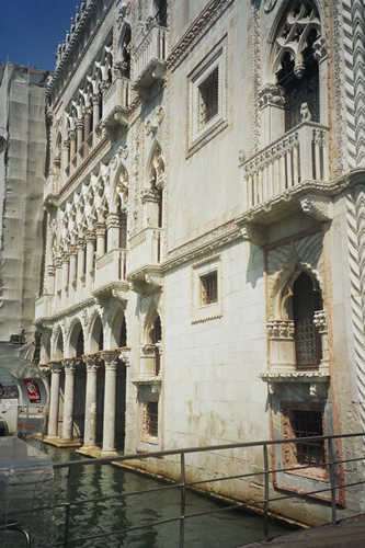 Der Einfluss des Ostens machte sich auch in der venezianischen Profanarchitektur des 13. Jh. bemerkbar. Obwohl man sich an romanischen Grundmustern orientierte, waren zierliche Säulen, filigrane Dekorationen, Loggien und Zinnenränder typische Merkmale der ersten venezianischen Palazzi. In dieser Zeit ging man dazu über, die Häuser nicht länger aus Holz, sondern aus gebrannten Ziegeln zu errichten und die Fassaden mit edlen Marmorsorten und farbigen Inkrustationen zu verkleiden. Offene Loggien im Erd- und Obergeschoss betonten die Leichtigkeit der Bauweise.
