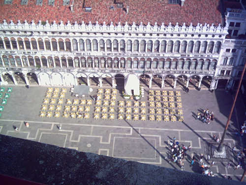 Das ist die weltberühmte Piazza San Marco mit den bekannten Stuhlreihen, auf denen man gemütlich seinen Capuccino oder Espresso geniessen kann, nicht gerade billig, aber man sollte es sich trotzdem gönnen, finde ich ! In der Bildmitte oben sieht man einen Baldachin, unter dem ein kleines Orchester spielt, man kann also auch die Atmosphäre geniessen ! Wer hier auf den Löwen klickt oder auf den "Zurückpfeil" kommt wieder zur Ausgangsseite "Venedig" zurück |