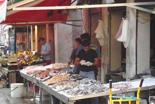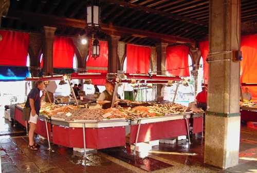 Der Fischmarkt ist ein unbedingtes "Muss" von Venedig. Er liegt wie der Gemüse- und Blumenmarkt ebenfalls nur ein paar Meter von der Rialto-Brücke entfernt direkt am Canale Grande. Seit 1.000 Jahren wird an diesem Platz Fisch und allerlei Meeresgetier verkauft. Früher stammte das Angebot im Wesentlichen aus den Gewässern der näheren Umgebung Venedigs.